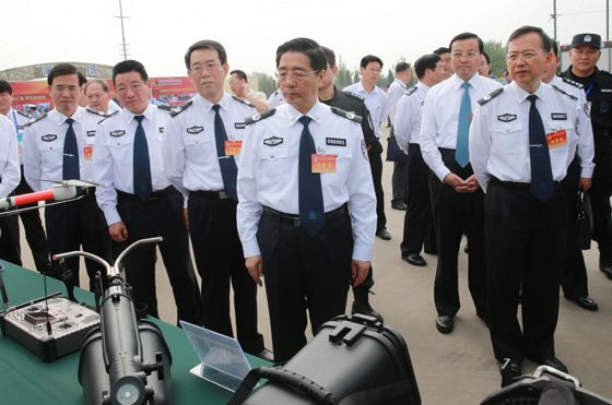9月10日,国务委员、公安部党委书记、部长郭声琨在山东青岛观摩全国公安机关应急处突实战演练。图为郭声琨观看公安特警装备展示。