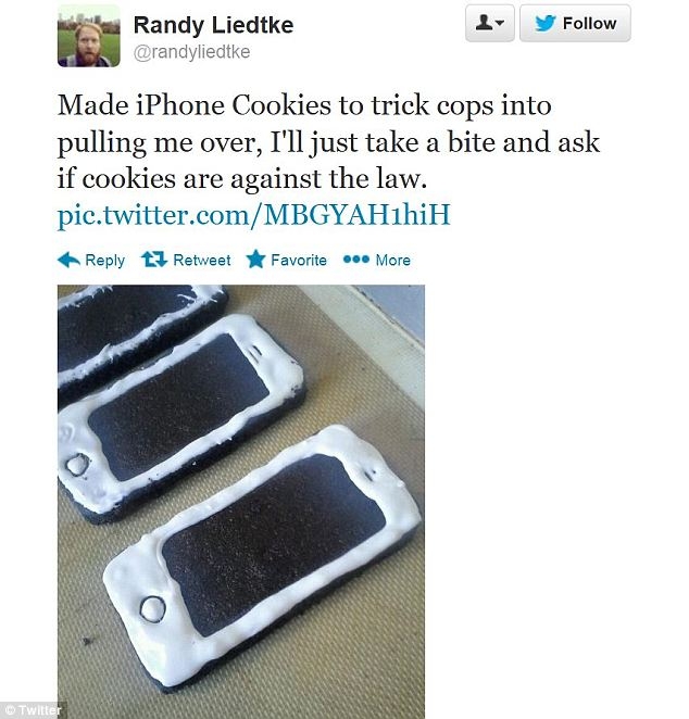 Randy Liedtkde日前突发奇想,他在网上发帖称,自己要制作些iPhone饼干调戏警察,具体实施方案是,在驾车行驶途中假装用手机打电话、看短信,当警察抓到他后,他就会幸灾乐祸地吃掉iPhone饼干,然后问,怎么?吃饼干也犯法吗?