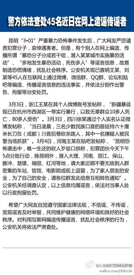 昆明恐袭案后警方依法查处45名在网上造谣传谣者 来源:新华法治 作者:佚名 发布时间:2014-03-06 15:36:57 浏览次数: 次 【字体:小 大】 据公安部“打四黑除四害”专项行动办公室官方微博消息,从公安部网安局获悉,昆明“3·01”暴恐案发生后,王某等45人在互联网上编造、传播谣言,故意制造恐慌情绪,扰乱社会秩序,被依法处以治安处罚。希望广大网民自觉遵守法律,不信谣、不传谣,共同维护健康的网络环境和良好社会秩序。 智能标签: 昆明恐袭案 网上造谣传谣者 相关内容 【打印正文】