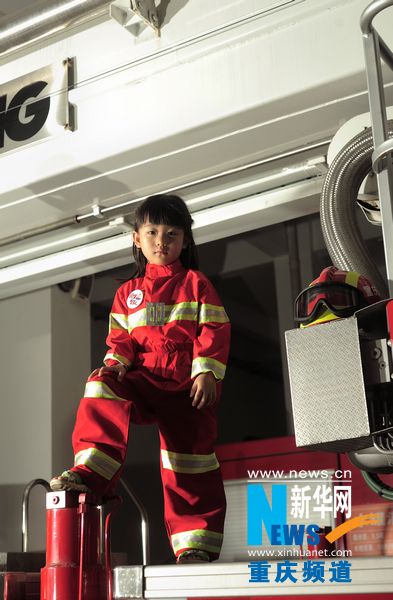小姑娘脚踏消防车,还真有几分“女汉子”的感觉。