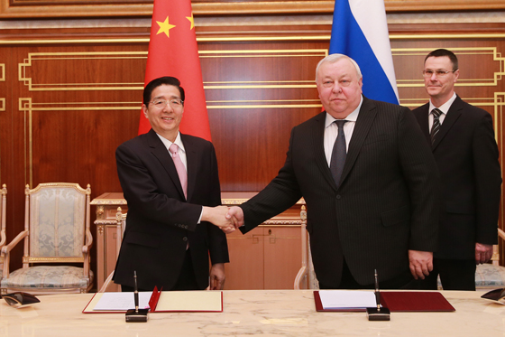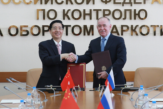 图为国务委员郭声琨与俄罗斯联邦麻醉品监管总局局长伊万诺夫举行会谈并签署部门间合作协议。
