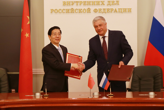 图为国务委员郭声琨与俄罗斯联邦内务部部长科洛科利采夫举行会谈并签署部门间合作协议。