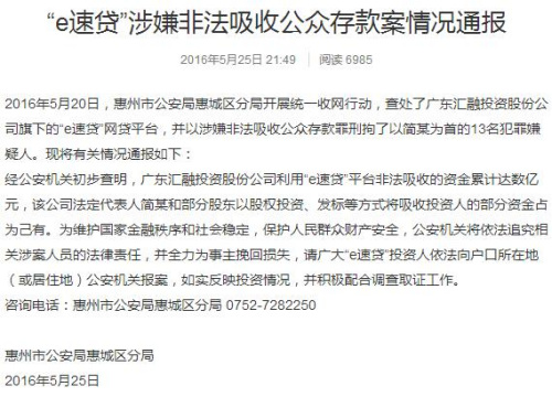 介绍,2016年5月20日,惠州市公安局惠城区分局开展统一收网行动,查处了广东汇融投资股份公司旗下的“e速贷”网贷平台,并以涉嫌非法吸收公众存款罪刑拘了以简某为首的13名犯罪嫌疑人。