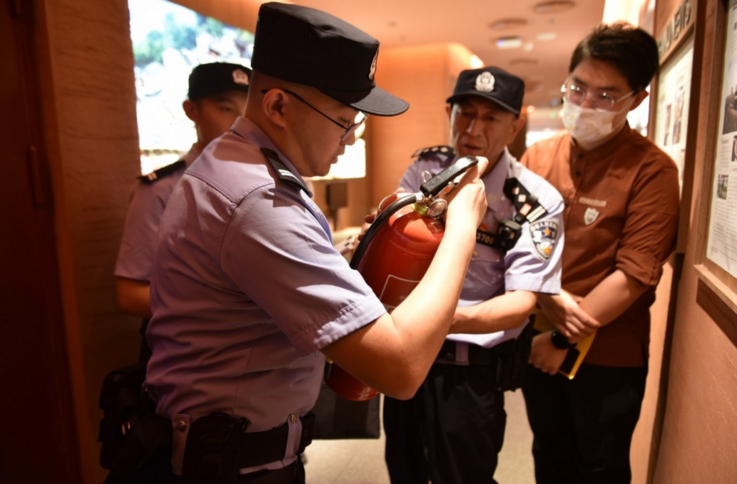 他又带徒弟逐一检查商场过道的每处反恐防爆器材。此外,黄金店铺的监控设备安装使用情况、商超冷库仓库的风险排查、音乐餐吧的噪音问题等安全事项,牛忠军也都一一进行提示。