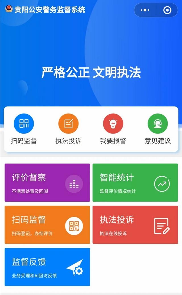 打开贵阳公安警务监督系统微信小程序,一眼就能看到“扫码监督”“执法投诉”“我要报警”“意见建议”等栏目设置。