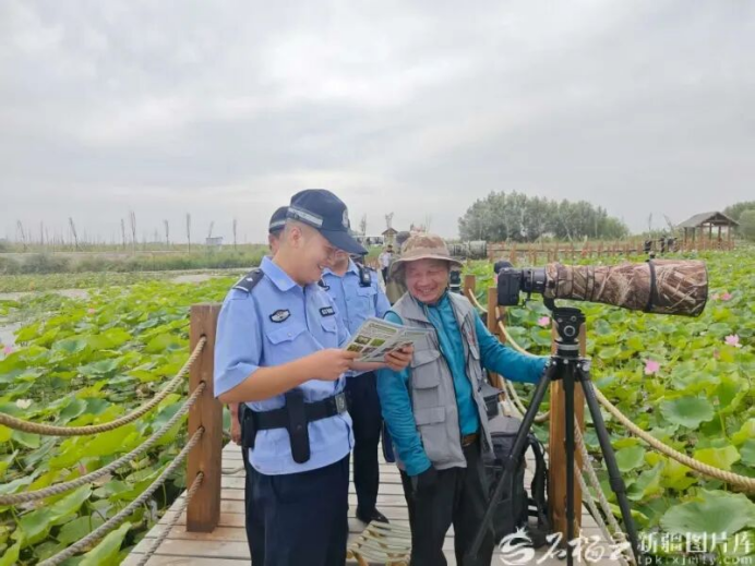 9月9日,玛纳斯县公安局兰州湾镇派出所驻生态警务联勤工作站民警辅警向摄影爱好者宣传鸟类保护知识。石榴云/新疆日报记者 隋云雁摄