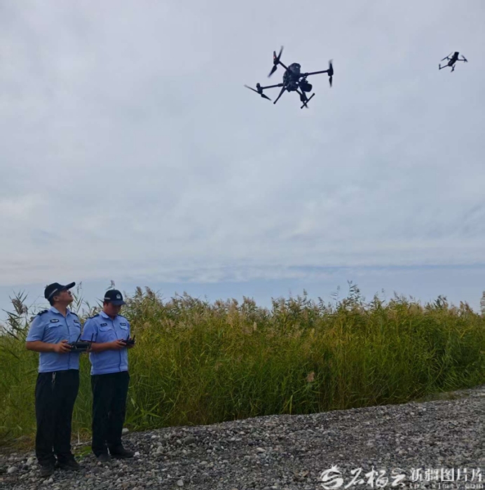 与此同时,湿地深处,玛纳斯县公安局兰州湾镇派出所驻生态警务联勤工作站民警辅警正开展日常巡逻。天空中,警航中队民警辅警操控的无人机持续盘旋,如同一双“天眼”,随时准备响应游客求助与野生动物保护需求。
