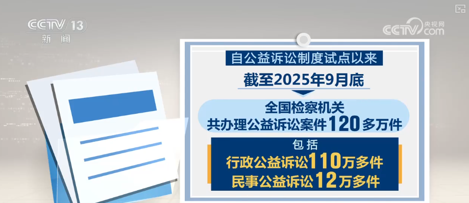自公益诉讼制度试点以来,截至2025年9月底,全国检察机关共办理公益诉讼案件120多万件,包括行政公益诉讼110万多件、民事公益诉讼12万多件。办案领域涵盖生态环境和资源保护、食品药品安全、安全生产、反电信网络诈骗等14个领域。