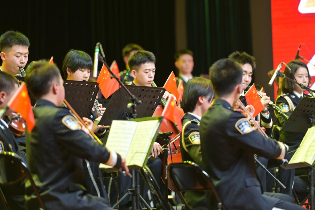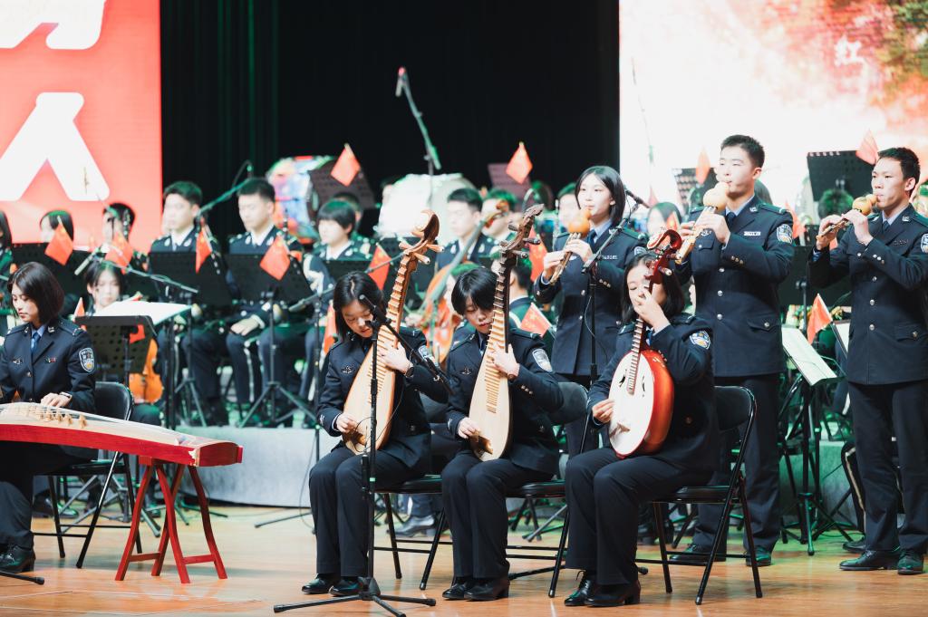 专场音乐会由“峥嵘岁月・觉醒年代”“深情礼赞・家国情怀”和“时代颂歌・逐梦未来”三个篇章,《钢铁洪流进行曲》《地道战》《少年壮志不言愁》《走向复兴》等15首曲目组成,警乐团通过管乐合奏、民乐协奏、弦乐重奏、声部齐奏等多种形式,融入舞蹈元素,融合叙事影像与诗化串词,在激昂的旋律中不失温情、在磅礴的气势中不失灵动,将一首首红色爱国作品完美演绎。奏响《中国人民警察警歌》之时,全场高歌,激昂旋律彰显公安队伍的忠诚担当。最后,气势磅礴的《歌唱祖国》响起,全场挥动五星红旗,歌声与乐声交融,以铿锵节奏激荡士气,以震慑之声交织忠诚誓言,掌声与欢呼声久久不息,专场音乐会圆满落幕。