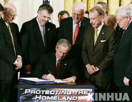 2006年3月9日,在美国华盛顿白宫,时任美国总统布什(中)签署延长《爱国者法》的法案。2001年“9·11”恐怖袭击事件后不久,美国国会通过《爱国者法》,作为反恐行动的法律依据。新华社发